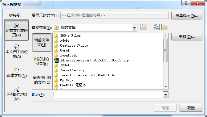 n 现有文件或网页:可以链接到电脑中的某一文件,也可以在地址栏中输入URL链接到Internet页面。