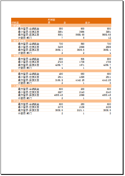 要求反映不同部门不同性别的业绩奖金的最高值、应发工资的最低值、实发工资的最大值及各个部门的人数;要求部门放在行字段区,性别放在列字段区。