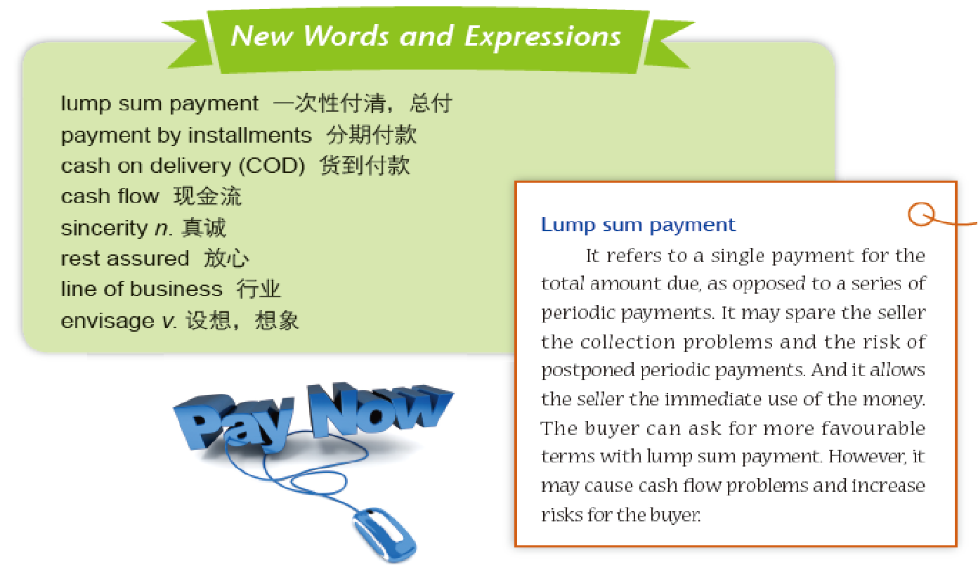 Mr. Liang: Good idea. Let's get down to business. Since this is our first order in this field, we would like a lump sum payment. It saves time for both of us.