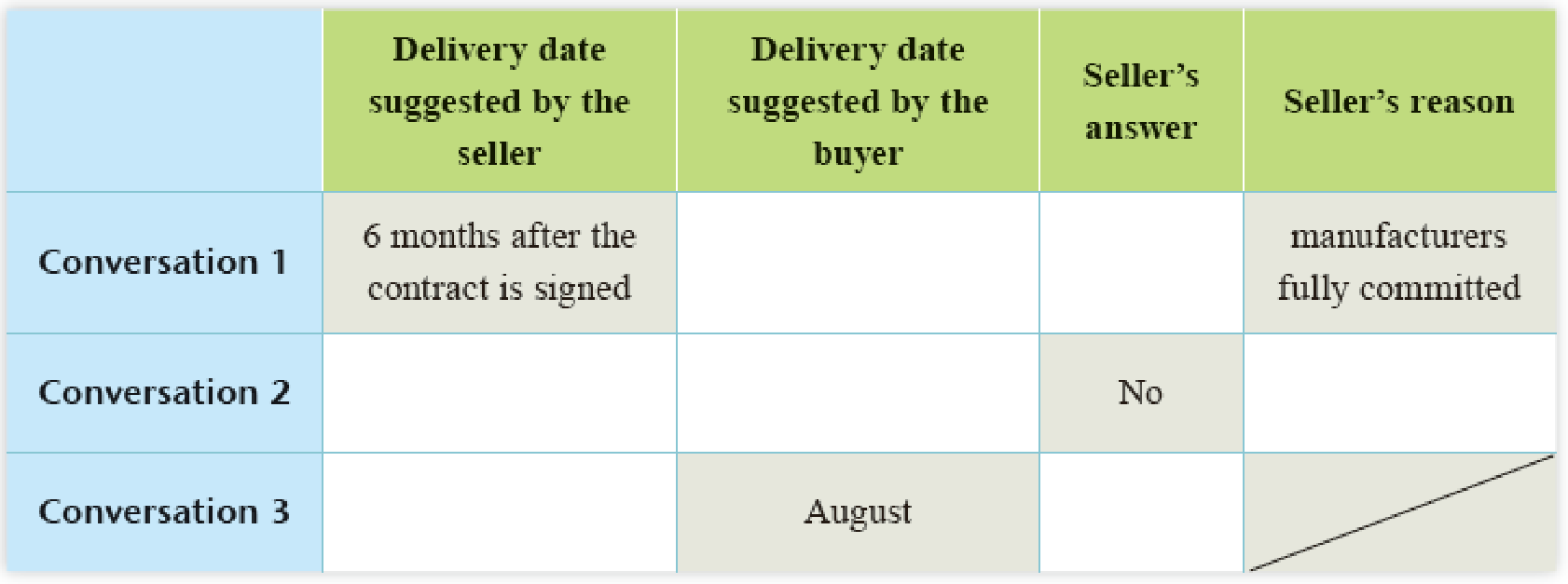 1. You will hear three conversations between sellers and buyers. Listen and complete the table below.