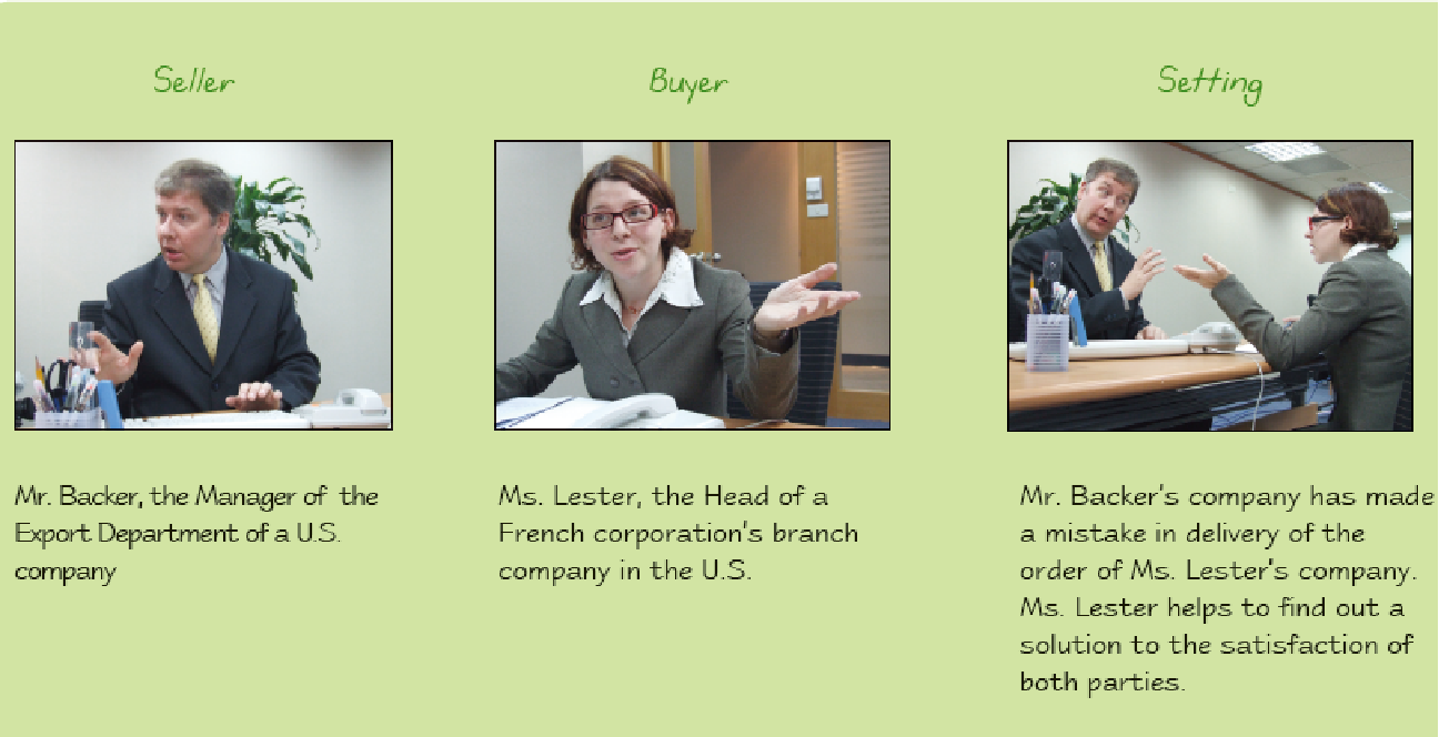 Ms. Lester: Hello, Mr. Backer. Nice to see you again. Unfortunately, we have a problem! I've just received a fax from my head office and it seems there may have been some misunderstanding about our last order.