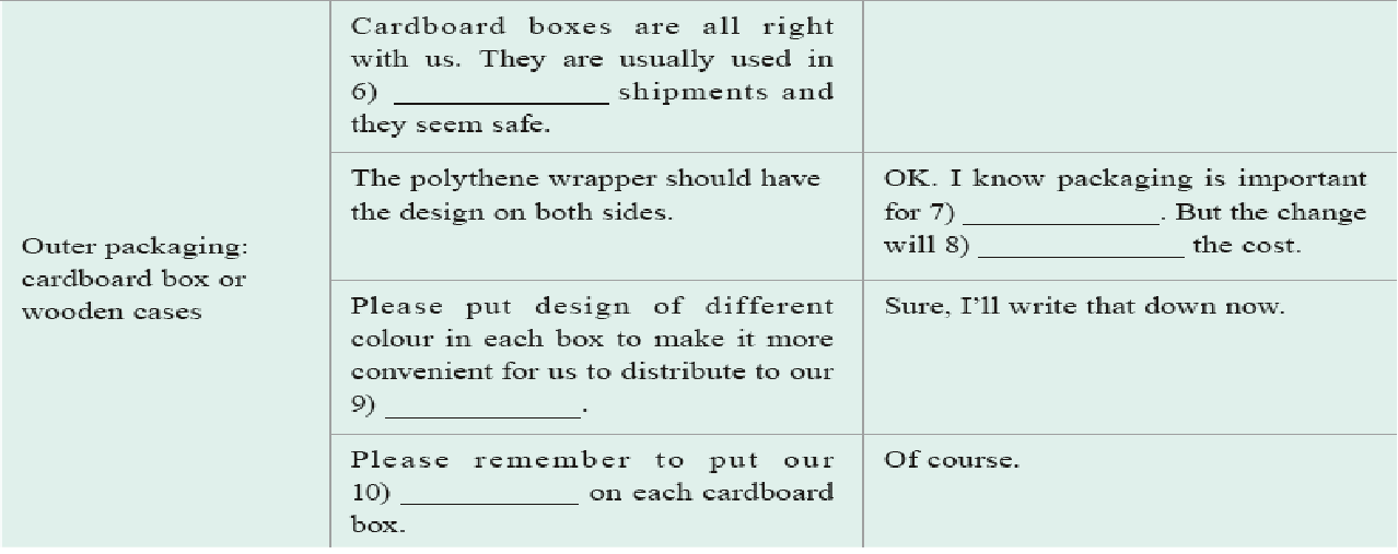 Mr. Zhang: Of course. Our usual practice for the products you ordered is, first, to put them into a transparent plastic wrapper as inner packaging, then, to put these into a cardboard box, or wooden case if you prefer, as outer packaging. Do you want to change the inner or outer packaging?