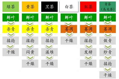 按照茶叶的加工方式及发酵程度不同,茶叶可分为不发酵茶类、半发酵茶类、全发酵茶类和后发酵茶,各类其制作基本流程见下图: