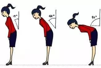 根据鞠躬的弯腰程度可有15、45、90度鞠躬三种。90度属于最高的礼节,平常的工作、生活中是很少行这种大礼。