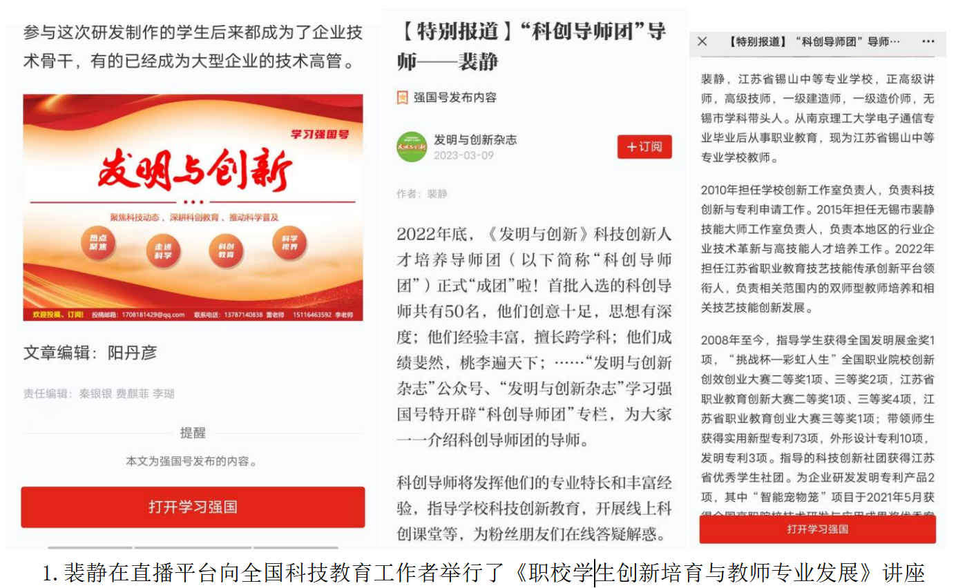 11 | 2023 | 裴静在直播平台向全国科技教育工作者举行了《职校学生创新培育与教师专业发展》讲座 | 国家级 | 《创新与发明》杂志社、学习强国平台 |