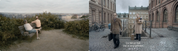 比较一下《关于无尽》开头两个场景的固定镜头运用,第一个场景中的被摄的两位主角的动作变化非常细微,近乎构成了一个静止的画面。有用的信息对白也只有一句,女人感叹“已经是九月了”,男人“嗯”了一声作为回应。实际上,导演把更多的留白空间给到了观众,对白只是一个引子,表示女人看着眼前的景色,感受到时间、季节的变换。导演通过这句话,提示观众可以跟着电影中的人物,一起欣赏初秋景色。这就好比,一个悠闲的午后,看着风景发呆的时刻,镜头愈宁静愈好。第二个场景,不再是构建一种环境,而真正形成了事件。事件表示有冲突,所以画框中的人物终于动了起来,导演甚至在一个画框里表现了上周和现在两个时空。但《关于无尽》始终没有让镜头动起来,因为它想表现的不仅仅是人和人之间的冲突,它不希望剧情过多地吸引观众的目光,它更希望人们静下来,思考人和人之间为何会产生这样的矛盾问题。