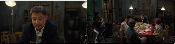 《爱情神话》中对推、拉镜头的运用可谓也是到了极致,从讲述者老乌的近景开始,一直拉到可以看到所有人在场的全景画面,再推回只有老乌的近景,结束他讲的这个浪漫的不可信的“爱情神话”。通过运动镜头去改变景别,即囊括了人物的情绪,又交代了众人听故事的情景,还致敬了常用餐桌作为美术道具的费里尼。