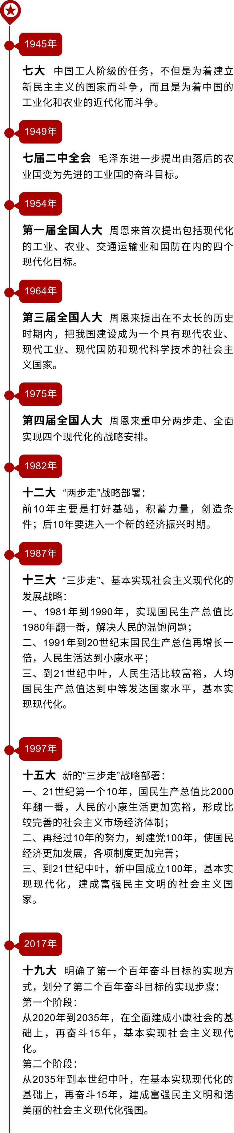 十九大明确了第一个百年奋斗目标的实现方式,划分了第二个百年奋斗目标的实现步骤:第一个阶段,从2020年到2035年,在全面建成小康社会的基础上,再奋斗15年,基本实现社会主义现代化。根据测算,2020年中国的国内生产总值将超过90万亿元,人均国内生产总值达到1万美元。2035年,现价国内生产总值将达到290万亿元,人均国内生产总值达到3万美元,有把握达到那时世界中等发达国家水平,有把握基本实现现代化。
