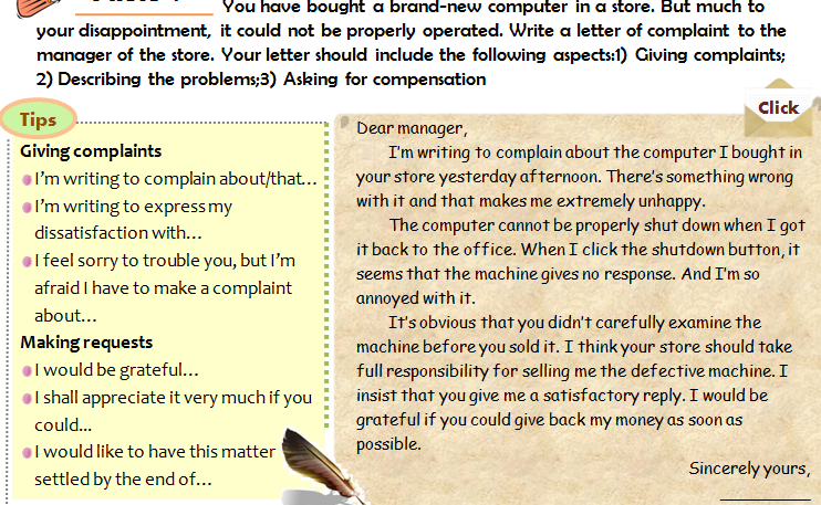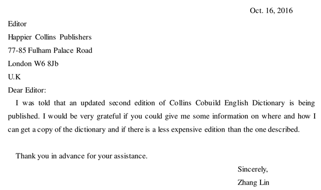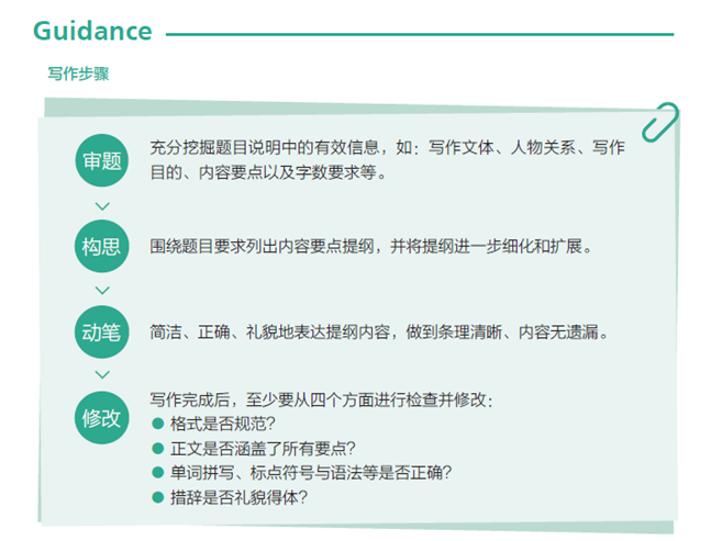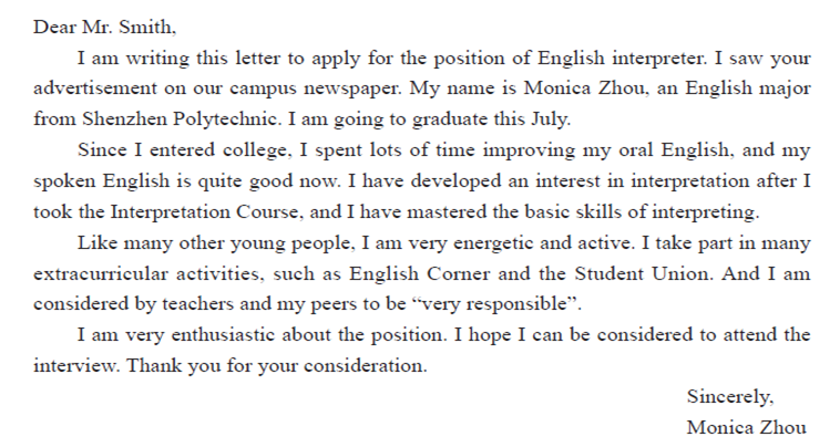 高职英语写作考试经常考查的书信类别有申请信、求职信、投诉信、邀请信、感谢信、祝贺信和道歉信等。要写好书信,必须掌握其格式和正文基本框架,了解先写什么,后写什么。正文通常由开头段、主体段和结尾段三个部分组成。