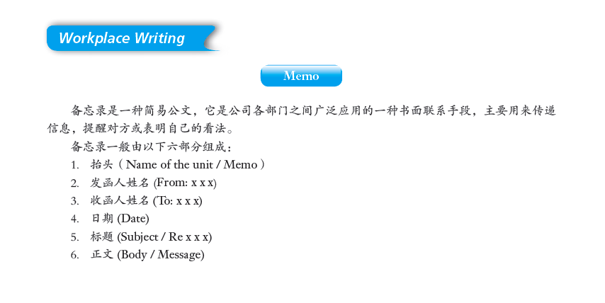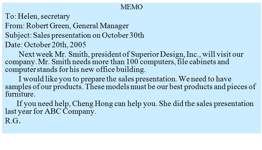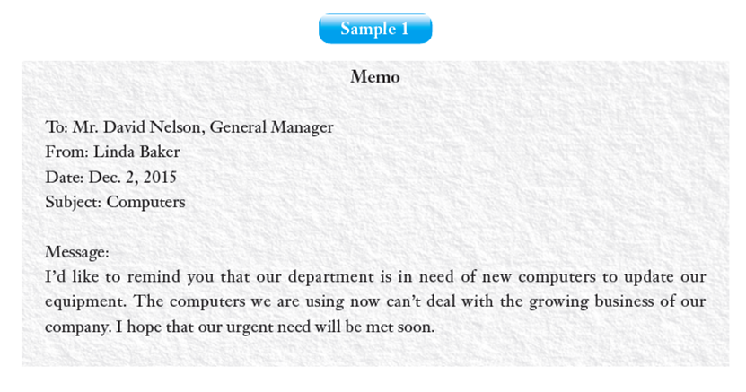 Memo, is a short official note written from one person to another within the same company or organization. The basic parts of a memoare listed below: