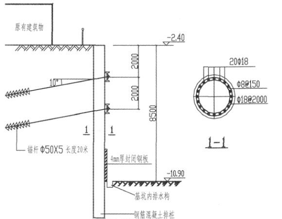 排桩可采用钻孔灌注桩、人工挖孔桩、预制钢筋混凝土板桩和钢板桩等。桩的排列方式通常有柱列式、连续式和组合式。排桩支护结构除受力桩外,有时还包括冠梁、腰梁和桩间护壁构造等构件,必要时还可设置一道或多道支撑或锚杆。排桩支护结构适合于开挖深度在6~10m的基坑。