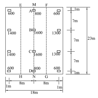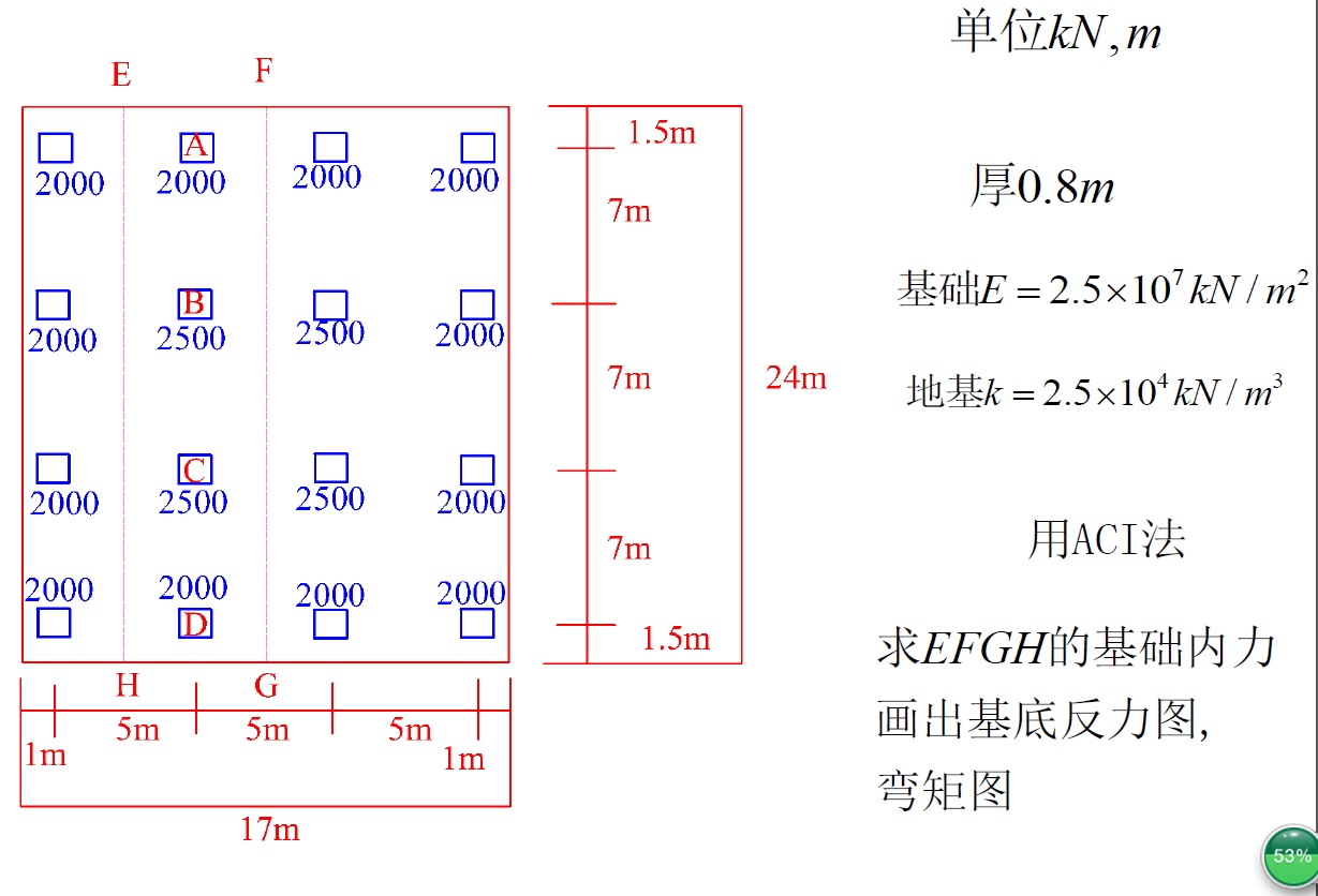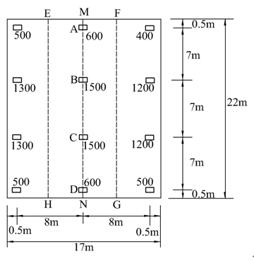 如图所示片筏基础,基础重度为24kN/m3,基础厚度为0.9m,柱距及柱荷载标准值(单位kN)如图所示,地基承载力特征值为fa=90kPa,用刚性板条法,验算地基承载力,求基础EFGH区域的内力,并画出相应的剪力图和弯矩图。