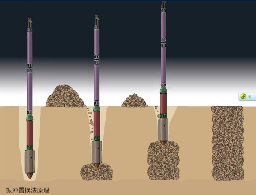振冲置换的加固机理:利用一个产生水平向振动的管状设备在高压水流冲击作用下,边振边冲在粘性土地基中成孔,再在孔内分批填入碎石等粗粒径的硬质材料,制成—根一根的桩体,桩体和原来的地基土构成复合地基,和原地基相比,复合地基的承载力高、压缩性小。这种加固技术被称为振冲置换法。