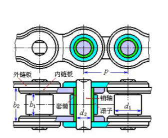 | 链号 | 节距 p/mm | 排距 pt /mm | 滚子外径d1 /mm | 内链节内宽 b1 /mm | 销轴直径d2 /mm | 链板高度 h2 /mm | 极限拉伸载荷 FQ/N(单排) | 每米质量 q/(kg.m-1) (单排) |