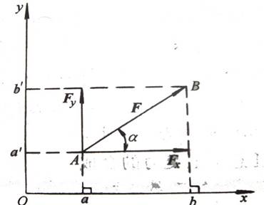 如图2-69所示,在直角坐标系Oxy平面内有一已知力F,此力与x轴所夹的锐角为α。从力F的两端A和B分别向x、y轴作垂线,得线段ab和a′b′。其中ab称为力F在x轴上的投影,以Fx 表示;a′b′称为力F在y轴上的投影,以Fy 表示。