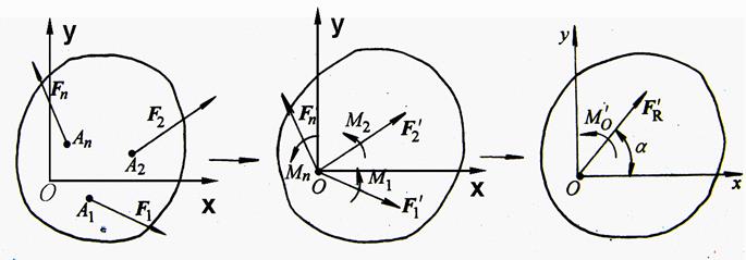 设刚体上作用有一平面力系F1 ,F2 ,… ,Fn,各力作用点分别为A1,A2,…An,如图2-74所示,在刚体上力系所在平面内取点O作为简化中心,将各力向O点平移,得到两个基本力系: