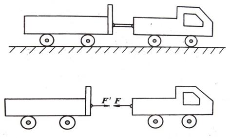 如图2-77所示,一货车拉一拖车,当以单独的货车或拖车为研究对象时,F、F′为外力,而以整个拖车系统为研究对象时,F、F′则为内力。