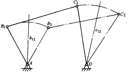 设计分析:图2-66可知,如能确定固定铰链A、D的中心位置,便可确定各构件的长度。由于连杆上B、C两点的轨迹分别在以A、D为圆心的圆周上,所以A、D两点必然分别位于B1B2、C1C2和中垂线b12和c12上。据此,可得设计方法和步骤如下: