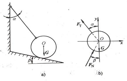 例2-9 重为G =2kN 的球搁在光滑斜面上,用绳拉住, 如图2-76a 所示,已知α=30°, β=15°,求绳子的拉力和斜面对球的约束反力。