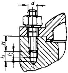 图7-80 双头螺柱联接 拧入深度H,当螺孔材料为: 钢或青铜 H≈d 铸铁 H =(1.25 ~ 1.5)d 铝合金 H =(2 ~ 2.5)d l2=(0.3 ~ 0.5)d l3=(0.7 ~ 1.2)d