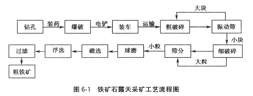 下面以铁矿石开采过程中产生的主要职业危害因素为例介绍矿山开采过程中职业卫生,主要生产工艺如图6-1。各工段产生的主要职业病危害因素如下。