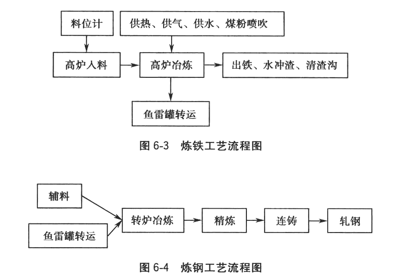 黑色金属包括铁、铬、锰等。冶炼分为火法冶炼、湿法提取或电化学沉积。火法冶炼又称为干式冶金,把矿石和必要的添加物一起在炉中加热至高温,熔化为液体,生成所需的化学反应,从而分离出粗金属,然后再将粗金属精炼。湿法冶金法是用酸、碱、盐类的水溶液,以化学方法从矿石中提取所需金属组分,然后用水溶液电解等各种方法制取金属。电化学沉积法是利用某种溶剂,借助化学反应(包括氧化、还原、中和、水解及络合等反应),对原料中的金属进行提取和分离的冶金过程。目前在钢铁冶炼生产过程中多采用火法冶炼,而在有色金属冶炼生产过程中多采用湿法冶炼或者电化学沉积。火法冶炼工艺流程见图6-2和图6-3。各个生产环节的主要职业危害因素如下。