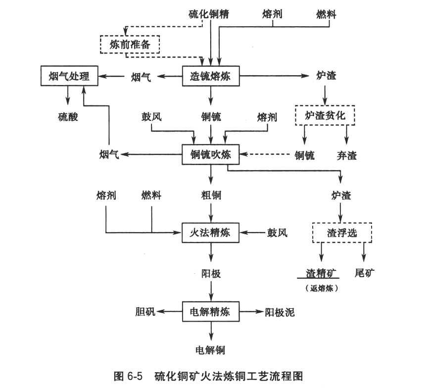 1.火法冶炼 火法冶炼一般是先将含铜百分之几或千分之几的原矿石,通过选矿提高到20%~30%,作为铜精矿,在密闭鼓风炉,反射炉、电炉或闪速炉进行造锍熔炼,产出的熔锍(冰铜)接着送入转炉进行吹炼成粗铜,再在另一种反射炉内经过氧化精炼脱杂,或铸成阳极板进行电解,获得品位高达99.9%的电解铜。该流程简短、适用性强,铜的回收串可达95%,但四矿石中的硫在造锍和吹炼两阶段作为二氧化硫废气排出,不易回收,易造成污染。近年来出现如白银法、诺兰达法等熔池熔炼以及日本的三菱法等,火法冶炼逐渐向连续化、自动化发展。硫化铜矿火法冶炼铜的工艺流程图见图6-5。