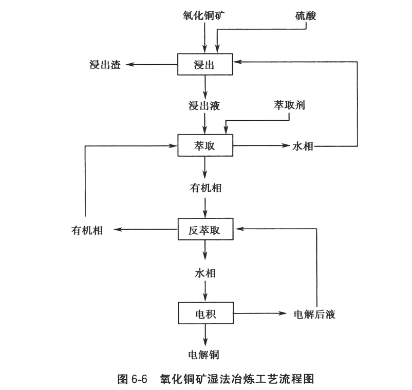 2.湿法冶炼 现代湿法冶炼有硫酸化焙烧-浸出-电积,浸出-萃取-电积,细菌浸出等法,适于低品位复杂矿、氧化铜矿、含铜废矿石的堆浸、槽浸选用或就地浸出。湿法冶炼技术正在逐步推广,预计本世纪末可达总产量的20%,湿法冶炼的推出使铜的冶炼成本大大降低。氧化铜矿湿法冶炼钢的工艺流程图见图6-6。