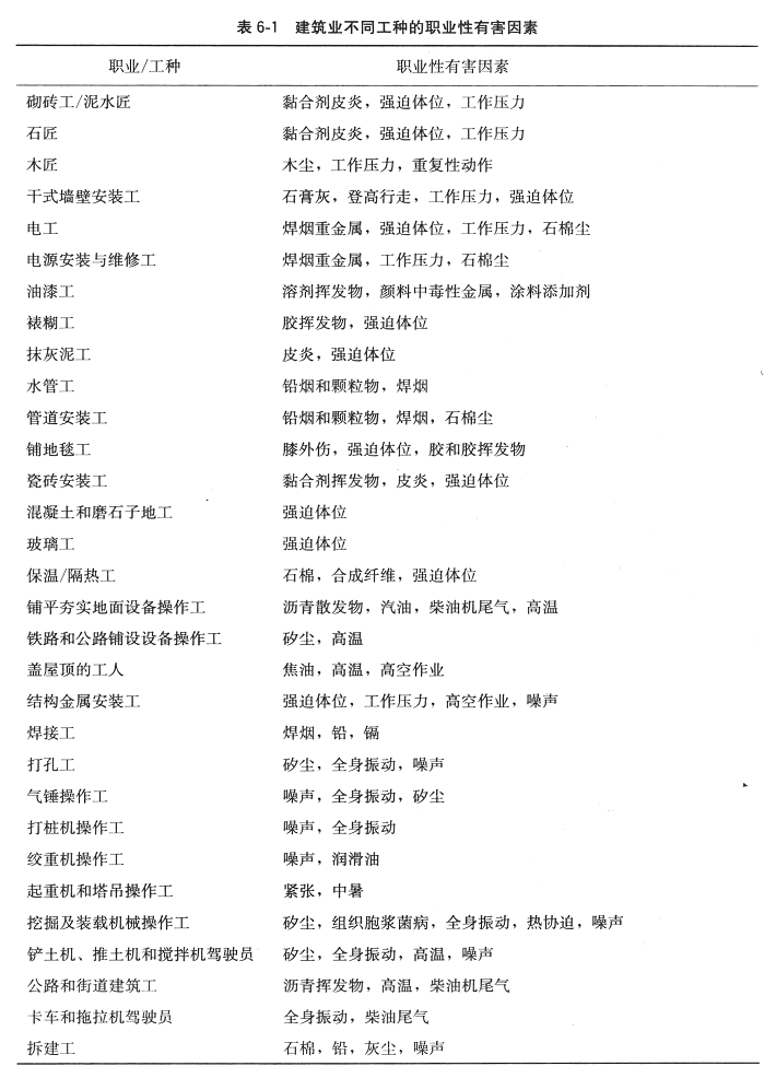 房屋和土木工程建筑业存在多种职业性有害因素,包括各种粉尘、毒物、异常物理因素等。具体来说,由于作业人员工种的不同,其所暴露的职业性有害因素的类型和水平也不—样(见表6-1)。