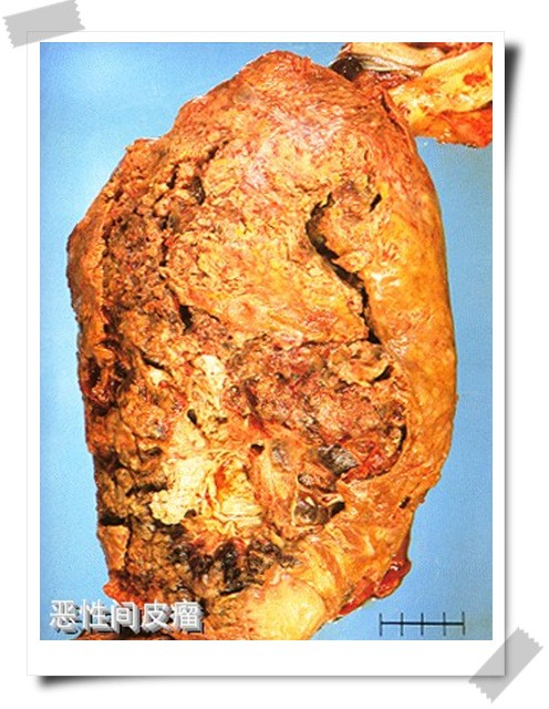 恶性间皮瘤:灰黄色肥厚胸膜肿瘤组织内可见大量坏死组织,坏死组织呈颗粒状。