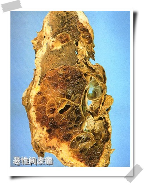 恶性间皮瘤:胸膜带状肥厚,呈灰白色,肿瘤组织局部囊性变。