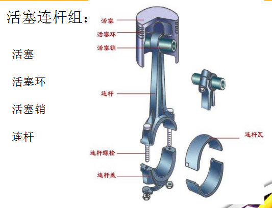 连杆组:连杆杆身、连杆盖、连杆轴瓦、连杆螺栓