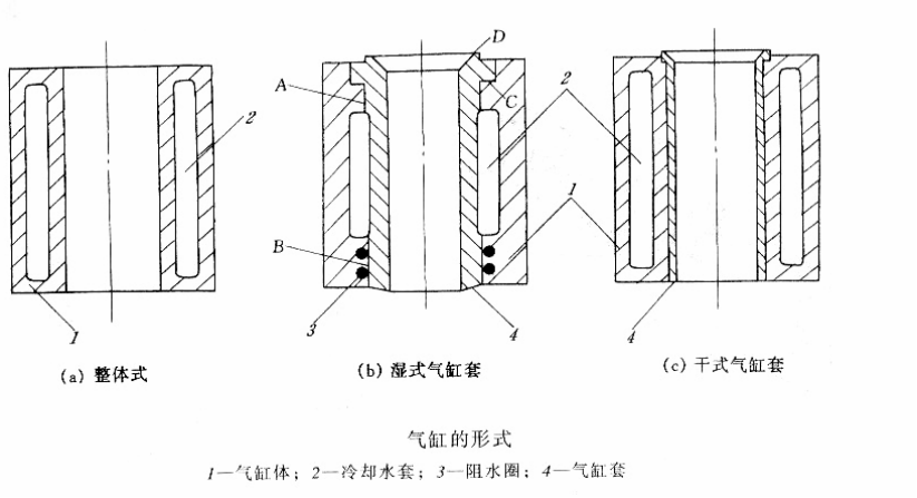 气缸结构形式有三种:无气缸套式,干气缸套式,湿气缸套式