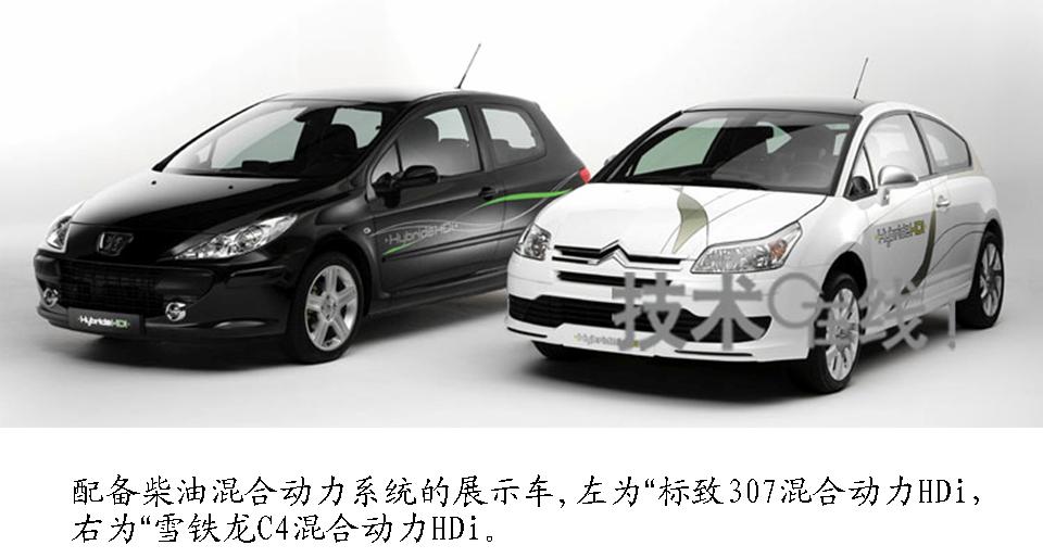 标致雪铁龙集团推出基于“柴油-电力”混合动力的两款展示车——标致307和雪铁龙C4。这种混合动力车平均百公里能耗为3.4升柴油,二氧化碳的排放量为每公里90克。在高速行驶模式下为80g/km,与307及C4的柴油发动机车型相比,分别减少了28%和45%。柴油混合动力车的燃效为29.4km/L,比汽油混合动力车提高25%,每100km可节省1L左右的燃料。