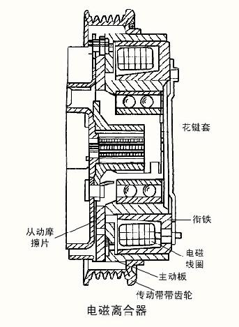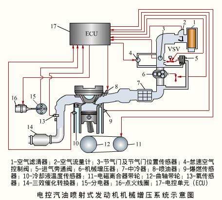 电控汽油喷射式发动机上所采用的一种机械增压系统示意图。图中机械增压器6为罗茨式压气机,由曲轴带轮12经传动带和电磁离合器带轮11驱动增压器6工作。空气经增压器增压后再经中冷器7降温,然后进入气缸。当发动机在小负荷下运转时不需要增压,这时电控单元(ECU)17根据节气门位置传感器3的信号,使电磁离合器断电,增压器停止工作。与此同时,电控单元向进气旁通阀5通电使其开启,空气经旁通阀及旁通管道进入气缸。爆燃传感器9安装在发动机机体上,它将发动机发生爆燃的信号传输给电控单元,电控单元则发出相应的指令减小点火提前角,以消除爆燃。
