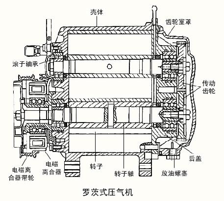 当转子旋转时,空气从压气机入口吸入,在转子叶片的推动下空气被加速,然后从压气机出口压出。出口与进口的压力比可达1.8。罗茨式压气机结构简单、工作可靠、寿命长,供气量与转速成正比。