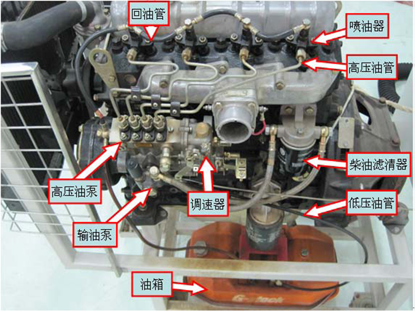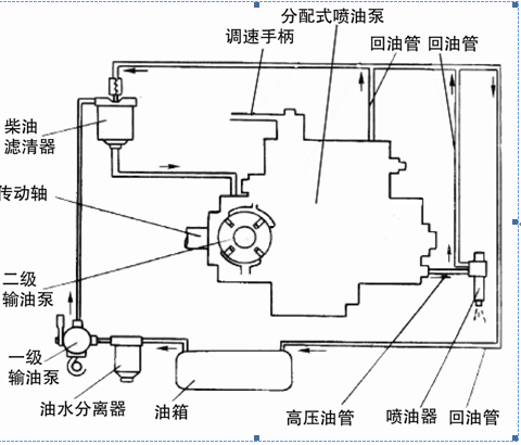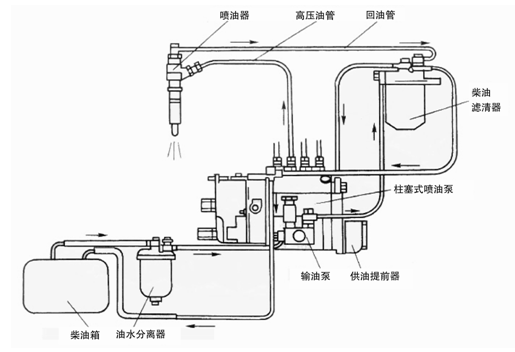 传统柴油机燃油系统都是由低压供油油路、高压供油油路和回油油路三部分组成。低压供油油路包括油箱、油水分离器、输油泵和柴油滤清器等部件,高压油路包括高压油泵、高压油管、调速器和喷油器等。