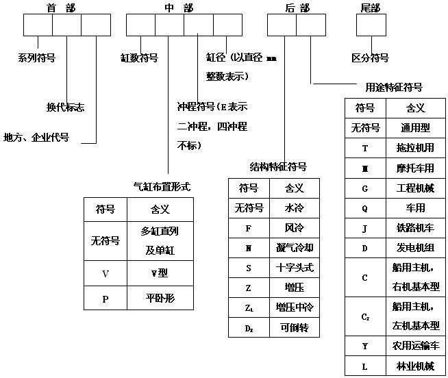 YZ6102Q—六缸直列、四冲程、缸径102、水冷、汽车用、YZ为厂代号