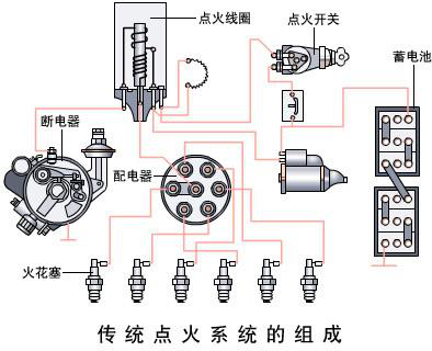 传统点火系统主要由电源(蓄电池和发电机)、点火开关、点火线圈、电容器、断电器、配电器、火花塞、阻尼电阻和高压导线等组成。