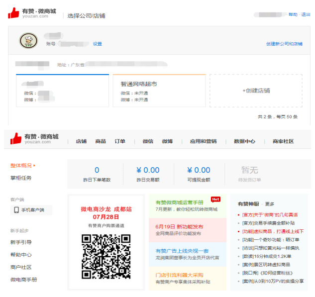 2、登录账号即可进入后台。后台显示与本账号相关的所有店铺,如图2-1-4所示。选择“智能网络超市”店铺。单击即可进入店铺后台,如图2-1-5所示。