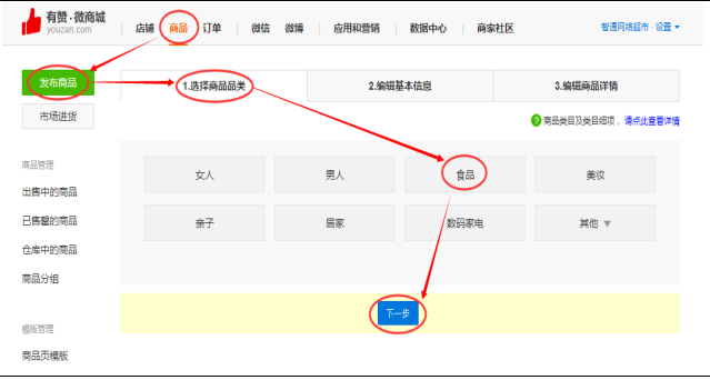3、进入店铺后台,单击“商品”进入商品管理页面,单击绿色“发布商品”按钮进入商品发布流程。第一步是选择商品品类。“智渊商城”是一家小型超市,现在以食品类商品“拉面丸子”为例演示发布流程,因此商品品类选择“食品”,单击“下一步”按钮。如图2-1-6商品类目选择所示。