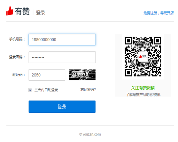 1、首先使用谷歌浏览器,进入有赞首页,单击右上角:登陆,进入登录界面,如图2-1-3登录界面所示。按要求,完成手机号码、登录密码和验证码三项信息填写,单击“登录”。