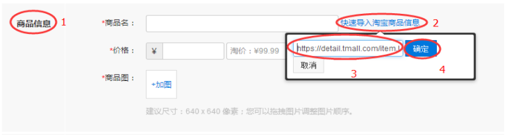 找到合适的商品链接后,回到有赞商场的店铺后台。重新单击“发布商品”,进入“编辑基本信息”页面,找到“商品信息”模块,单击“快速导入淘宝商品信息”,在弹出的文本框中,粘贴淘宝找到商品链接,单击“确定”。如图2-3-1快速导入淘宝商品信息所示。