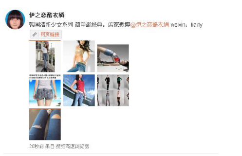 2、编辑第一条微博信息“韩国清新少女系列 简单最经典。店家微博@伊之恋酷衣绱 weixin:liarly”。