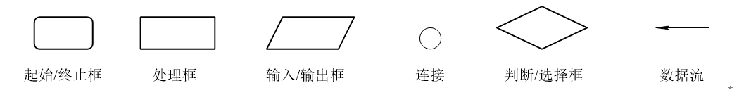 (2) 使用流程图。用流程图描述算法时,要注意使用规范的流图符号。如图所示,矩形框用于书写处理步骤,菱形框用于书写判断/选择,椭圆形框用于表示起始和终止。用流程图描述大型程序时,通常按描述的精细度分成若干级,先画粗框,再逐步细化。