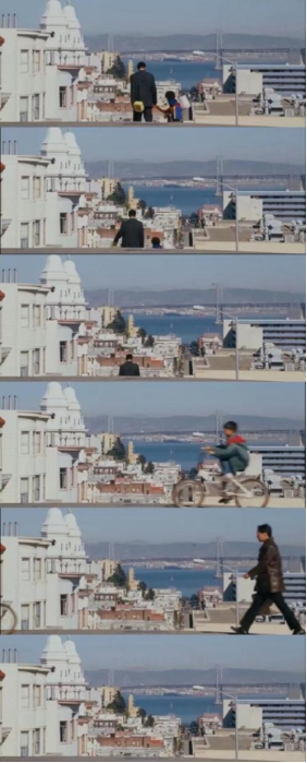 在影片《当幸福来敲门》中,出现了一组同样类型的摄影机内部调度的镜头。在影片中,分别在0:17:20、0:56:13、1:17:46、1:35:39(如图《当幸福来敲门》内部调度1)中构成了一组父子二人并肩行走的人物组合调度。在四个剧情时间中,展示了父子二人一同携手经历人生挫折后坚韧前行迎来希望的过程。在这一组镜头的内部调度中,导演一直利用人物前行的直线调度。其中,有父子二人正面对着镜头,迎面走向镜头。以这种调度方式营造出父子二人直面生活,勇敢前行的氛围;也让观众直面看到父子二人一路同行,父子情深的情感关系。还有父子二人背对着镜头,进行渐远的画面调度,这种调度方式为观看者营造了默默关注的参与感,也表现出父子二人为了生活努力奔波的状态。在直线的摄影画面内部调度中,将父亲的坚韧乐观和二人的懂事贴心的性格以正面视角展示给观众,也以背影视角调动观众的观看情绪。