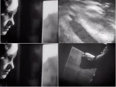 表现蒙太奇较之叙事蒙太奇更为抽象,它擅于表现情感、情绪,将内在的心理状态以外在的影像手段表现出来。可细分为对比蒙太奇、隐喻蒙太奇、心理蒙太奇和抒情蒙太奇。1931年拍摄的先锋实验短片《秋天之火(Autumn Fire)》就对表现蒙太奇做了众多的尝试,导演将女人望向窗外,看到男人路过的影子两个画面剪辑在一起,形成了隐喻蒙太奇,暗示女人对身处异地的恋人的思念,仿佛总能看到他的影子在身边。再接着,导演又再次切回女人望向窗外的画面,并把这个画面和看报纸的男人的画面衔接在一起,又构成了心理蒙太奇,表明女人正在幻想此时此刻恋人正在做什么。