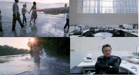 影片14分24秒,有一句杰克的独白,内容是讲述自己的兄弟死于19岁。由这句独白作为引子,开始了杰克对兄弟的追思。追思的场所是杰克工作的地方,耸立的摩天大楼之内,现代化的钢筋水泥之地。伴随着杰克的工作场景,不时地插入回忆蒙太奇的段落,00:15:04闪现一秒的海边散步,00:15:47-00:15:52,00:15:57-00:15:59的水中嬉戏。自然与城市的画面比对,也是童年的自由感与成年的束缚感的一组比对。因此,该处不仅包含心理蒙太奇,也囊括了对比蒙太奇。