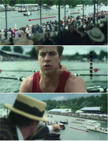 中性镜头没有明确的方向性,在画面剪辑时,可以利用中性镜头进行画面过度,缓和越轴后画面带来的跳跃感。比如电影《社交网络》(2010年导演大卫·芬奇)在皮划艇比赛中,表现皮划艇竞争的速度感,导演用了不同轴线的拍摄方式进行画面内部和外部的调度。图中第一个镜头皮划艇方向由右到左,中间插入中性无方向镜头后,第三个镜头中皮划艇的运动方向由左向右,拍摄时轴线跨越,运动方向相反。但插入中性间隔镜头后,画面衔接顺畅。