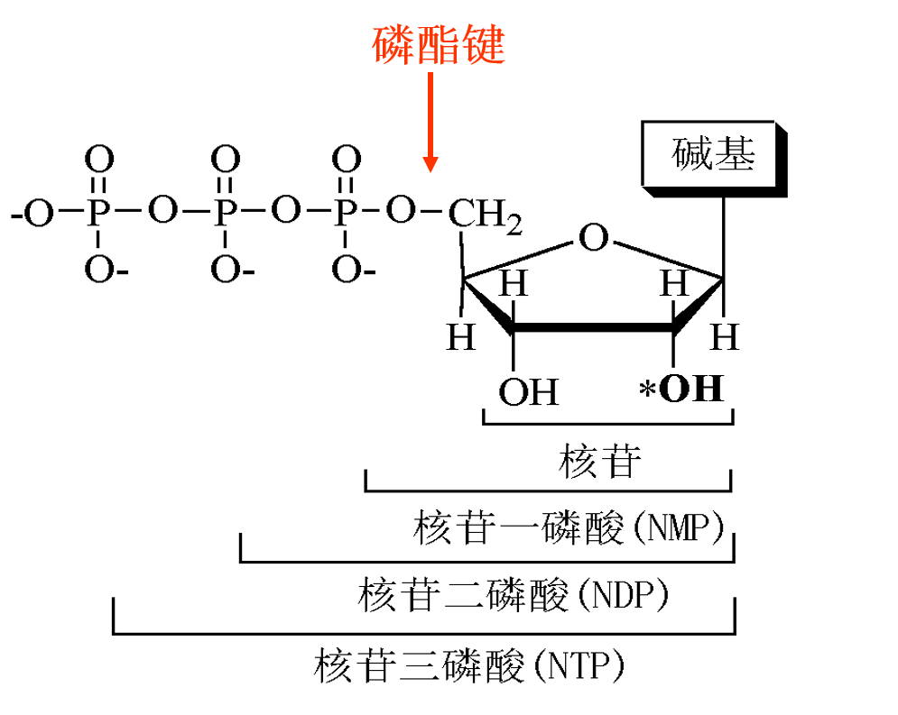 核苷酸之间通过上一个核苷酸的3'-羟基与下一个核苷酸的5'-磷酸基脱水缩合形成3',5'-磷酸二酯键彼此相连。